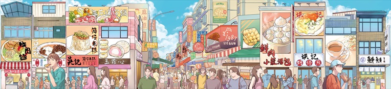 「台湾センターが発行するパンフレットのイラストは以前から大変気に入っており、毎年個性豊かなパンフレットが楽しみでした。今回制作のお話をいただいて、とても嬉しかったです。メインテーマを美食としましたが、範囲が広く、代表的な食べ物を選ぶのが難しかったです。そこで、台湾の「行列」文化を取り入れることにしました。台湾人は美食のためならば、数時間並ぶのも苦じゃないです。背景シーンとして台中の一中街を選びました。私自身、よくグルメを楽しんでいた思い出の場所です。」