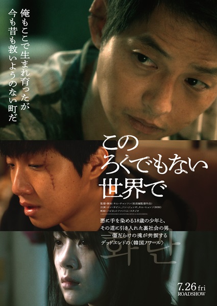 その他のビジュアルでは、ヨンギュとチゴンのふたりのアップが多用され、ヨンギュの生々しい頬の傷、チゴンの引きちぎられたかのような耳が否応なしに目に飛び込んでくることだろう。生まれながらの格差、寂れた町、親ガチャ・・・韓国映画界がこれまでに描いていきた世界がここでも浮き彫りになる。偶然なのか、必然なのか、奇しくも出会った、同じ境遇の少年と裏社会のふたり。本ポスターに記されたように、このろくでもない世界で傷だらけの魂が響き合ってしまった彼らにほんの一瞬でも陽が注ぐことはあるのだろうか?是非劇場で確かめて頂きたい。