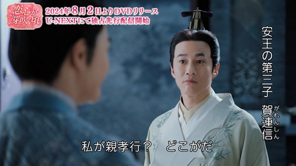 また、その王妃がこの世を去って30年あまり…この時期になると塞ぎこむ安王のため、第二王子・賀連儲(がれんちょ/リー・ジンロン)、第四王子・賀連修(がれんしゅう/シェン・タイ)らが贈り物を持参し集まった中、現われたのは賀連信。後継者争いで互いに腹の探り合いをしている兄弟たちの中でも、遊び人と言われ、飄々としていて何を考えているのか分からない第三王子だったが、実は裏の顔が…。