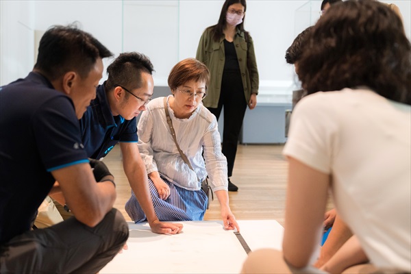 国立台湾美術館の薛燕玲キュレーターが展示チームと「甘露水」の展示位置について議論。(国美館提供)
