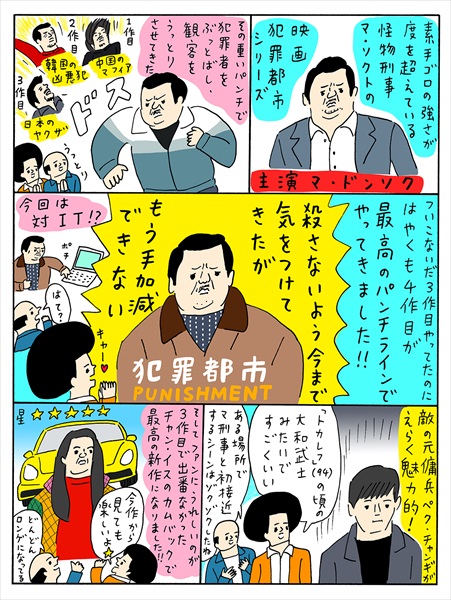 この度さらに、漫画家でイラストレーターの花くまゆうさくによる、『犯罪都市』振り返り漫画も到着!こちらはシリーズファンの花くまゆうさくが、「素手ゴロの強さが度を超えている」と称する『犯罪都市』最強の主人公・マ刑事の魅力を振り返りながら、最新作の見どころを紹介するもの。漫画には「えらく魅力的!」と紹介されるシリーズ最強ヴィラン、ペク・チャンギや、シリーズのユーモアパートを牽引し、ファンからの人気も高いチャン・イスも登場!前作『犯罪都市 NO WAY OUT』では残念ながら出番がなかったチャン・イスの暴れっぷりにも期待が膨らむ内容となっている!