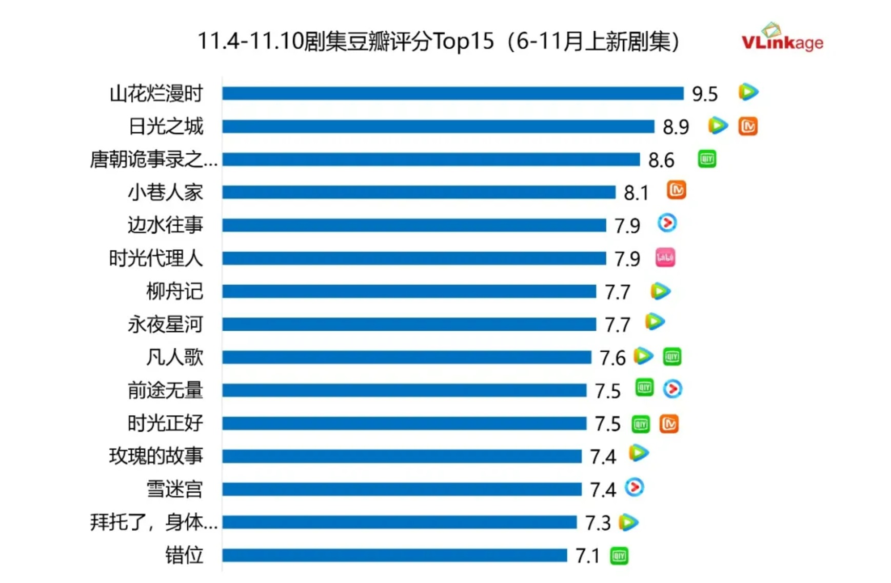 口コミの観点から分析すると、先週を含む6月から11月の連続ドラマの豆瓣評価トップ15は上記データの通りで、「小巷人家」が評価8.1、「永夜星河」が7.7を獲得しており、これら 2 つの作品は優れた口コミフィードバックを得ただけでなく、パフォーマンスも優れていた。