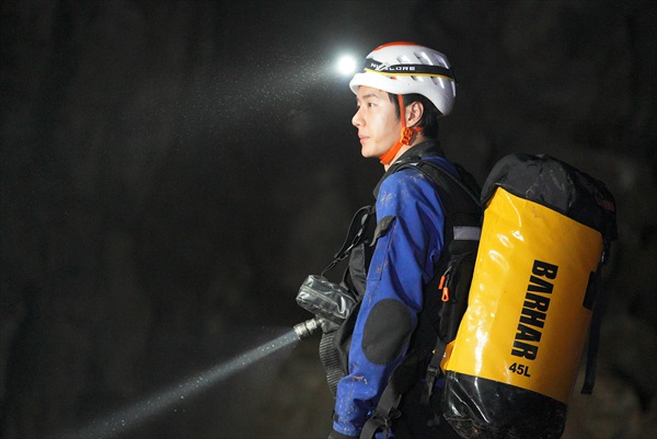 光のない洞窟の中で、底の見えない深い陥没穴に挑む。1本のロープを頼りに、己の恐怖心と戦いながら、深い空洞を背にして岩壁を70メートル下降していく。