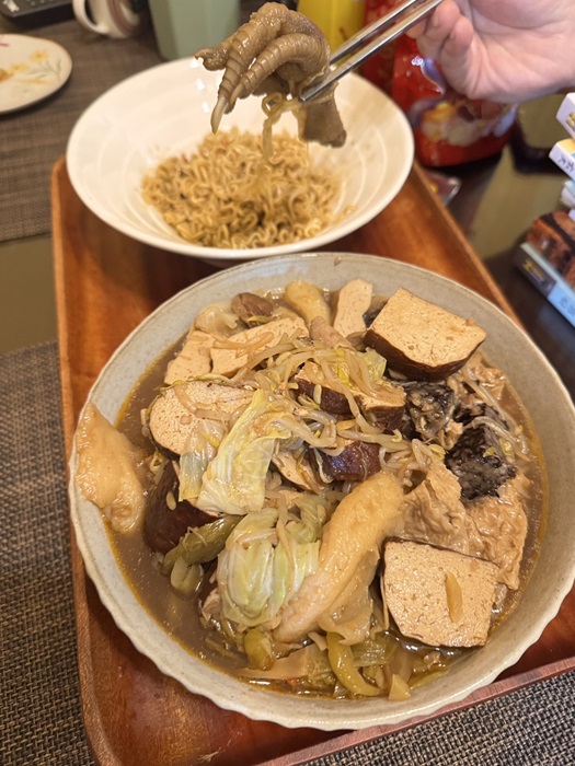 ローズさんのお友達・劉さんのこの日のチョイスは、干し豆腐、キャベツ、王子麺(ワンズーミェン)や米血糕(ミーシュエガオ)、鶏の足などルーウェイの定番食材です。
