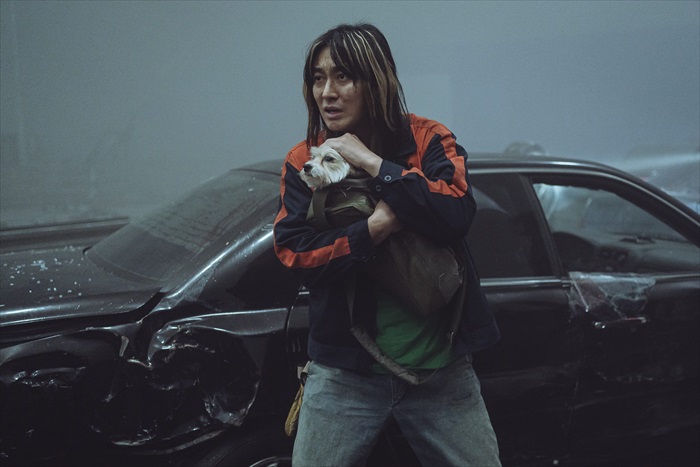 そして、地獄絵図と化した橋の上で切迫した表情を浮かべる生存者たちの新場面写真を4点解禁!爆発を目の当たりにして呆然とするジョンウォンとギョンミン、身を寄せ合うプロゴルファーのユラ(パク・ジュヒョン)とミラン(パク・ヒボン)の姉妹が切り取られているほか、愛犬ジョディを力強くぎゅっと抱きしめるチュ・ジフン演じるチョバクの姿も。さらに、生存者たちが脱出しようと団結し、手探りながら霧中を突き進む場面も到着した。韓国映画界最高の製作チームが手がけた本作に期待しよう。