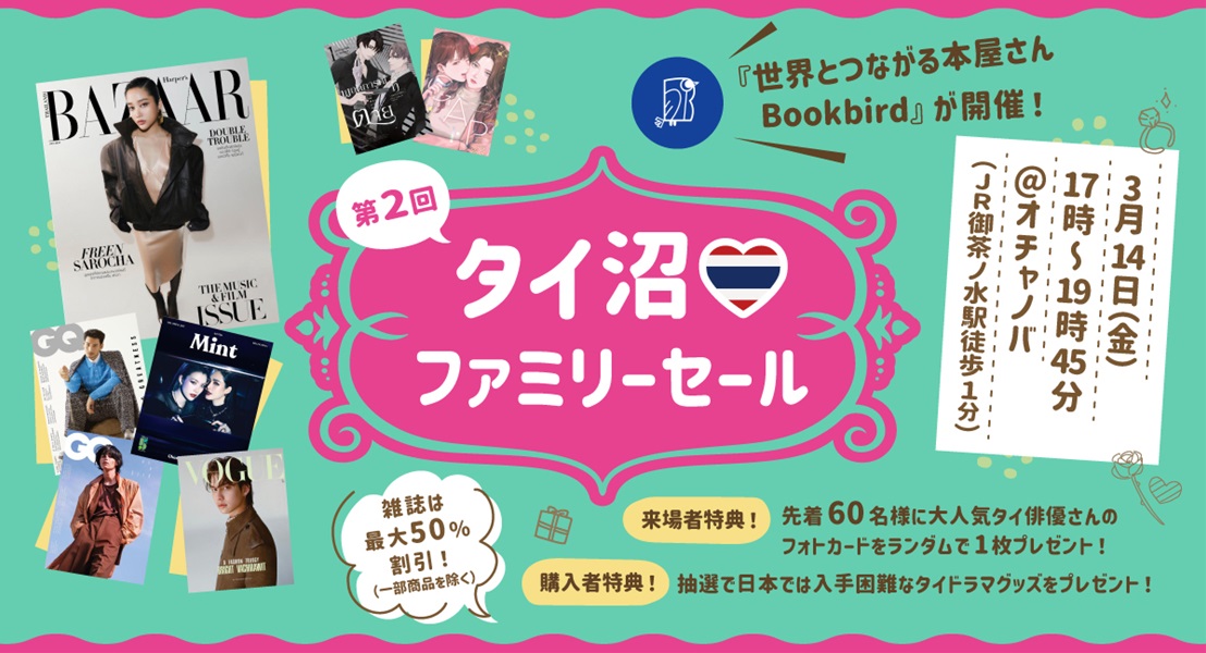 日販アイ・ピー・エス株式会社の企画・運営する、海外雑誌や海外絵本などを中心に常時約3000点の紙出版物を取り扱う個人向けのECサイト「世界とつながる本屋さん Bookbird」(https://store.shopping.yahoo.co.jp/nippanips/)が、タイ俳優表紙雑誌やタイドラマ小説が最大50%割引となる『第2回タイ沼ファミリーセール』を、2025年3月14日(金)に御茶ノ水にて開催。