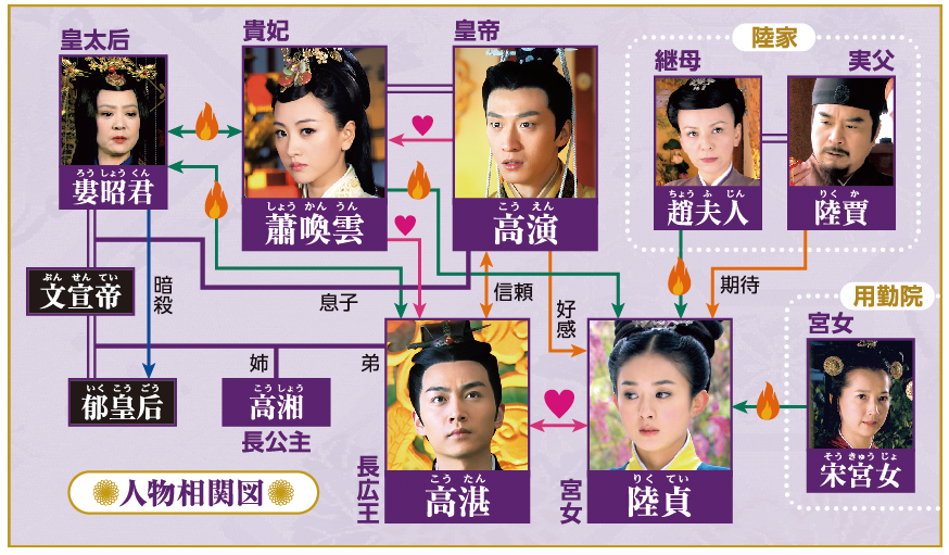 ヒロイン・陸貞は、欲望渦巻く宮廷の中で、多くの涙を流しながらも、苦難を乗り越え、懸命な努力と類まれな才能で宰相にまでのぼりつめていった善良で聡明な女官。放送開始するや否や、中国の主要放送局全32局で視聴率1位を獲得するなど高視聴率を獲得した大ヒット作だ。ヒロイン陸貞を演じるのは「明蘭」「花千骨」のチャオ・リーイン。彼女とロマンスを繰り広げるのは、「夢華録」「月に咲く花の如く」チェン・シャオ&中国版「テニスの王子様」キミー・チャオの2人。美しく端正な顔立ちの2人とのロマンスも必見。また、主役・陸貞の豪華絢爛な衣装にも注目。