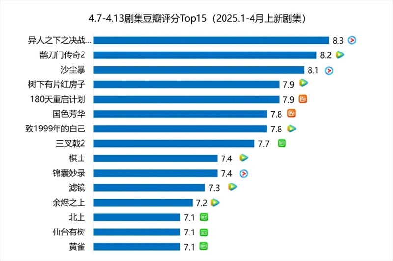 本週を含む2025年1月から2025年4月のドラマの豆瓣評価トップ15では、「異人之下之決戦碧遊村」「鵲刀門伝奇2」「沙塵暴」の3作品が依然として高い評価を獲得している。
