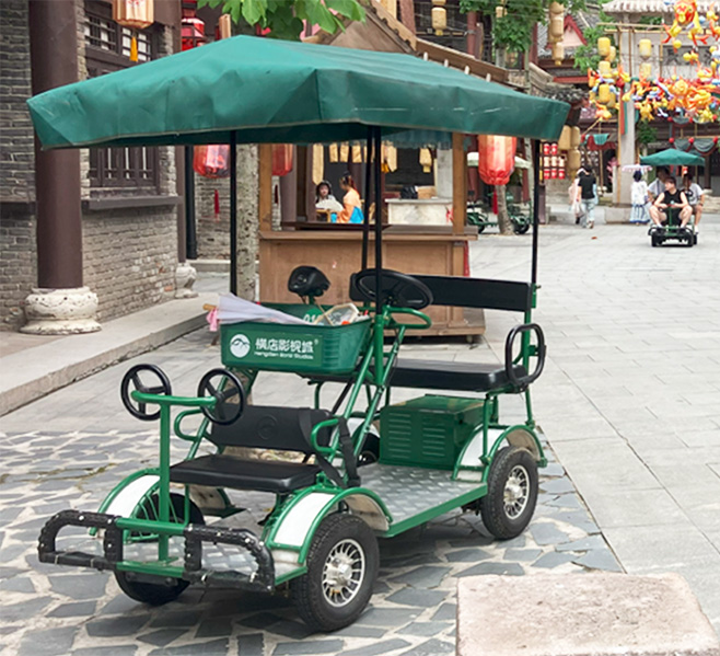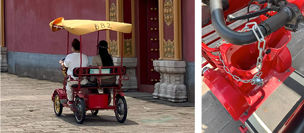 施設の入口近くでカートの貸し出しがあります。施設によって置いてあるカートの種類は異なり、足こぎタイプから電動バイク型のものまで、色々なタイプが。値段はデポジット200元+一日利用160元(値段変動あり)。支払いはQRコードをスキャンして、Alipay(支付宝)かWeChatPayとなっています。目的地についてカートを停めておくときは、大きな鎖つきのカギを忘れずにかけましょう。
