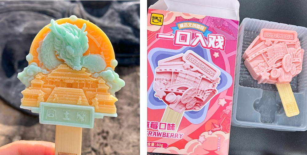 中国の観光地でよく見かけるご当地アイス。もちろん、横店バージョンもあり! 写真は秦王宮で購入したマンゴ―&コットンキャンディ味と、明清宮苑で購入したストロベリー味。施設によって形やフレーバーの違うアイスがあるので、いろいろとお試しするのも楽しい! 最初は冷えて固いけれど、とても溶けやすいタイプのアイスなので、炎天下で食べる際にはご注意を。