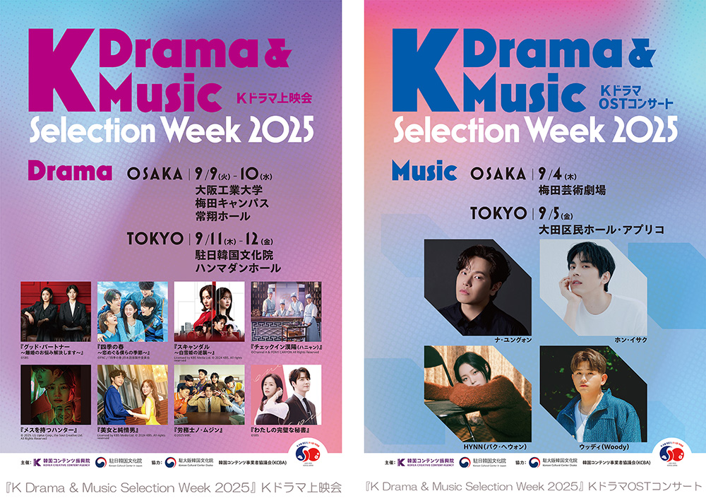 韓国コンテンツ振興院(KOCCA)と駐日韓国大使館 韓国文化院は、今年、日韓国交正常化60周年を迎える節目の年を迎えたことを記念して、Kカルチャーの多彩な魅力を伝えるイベント『K Drama & Music Selection Week 2025』を9月4日(木)~12日(金)に東京と大阪の2都市で開催します。