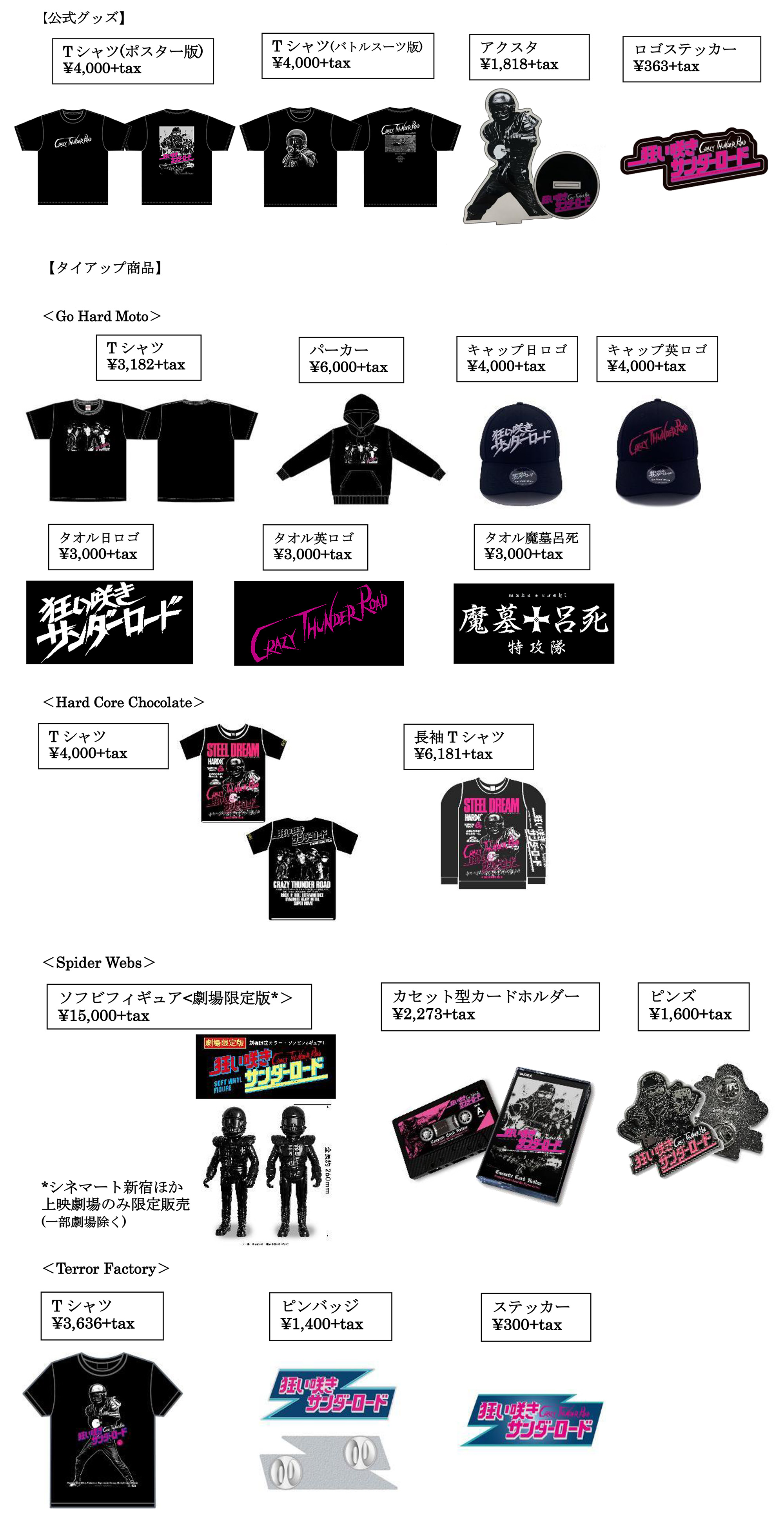 また、今回の復活上映にあたってコラボが決定した、テロファクトリー、ハードコアチョコレート、スパイダーウェブ、Go Hard Motoといったブランドとのタイアップ商品、及び公式グッズの詳細も発表に。劇場のみの限定発売となる主人公・仁のソフビフィギュアをはじめ、Tシャツ、ステッカー、キャップなど、プレミア必至のファン垂涎アイテムの詳細が一挙に発表された。これらのアイテムはシネマート新宿ほかの劇場で先行販売された後、各ブランドの公式サイト等でも販売されることが決まっている。アイテム詳細は以下の通り。