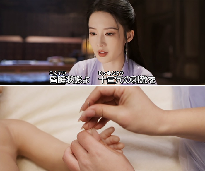 呼吸が弱まってしまった徐沫を救うために、小さな指に鍼を打っていく薛紫夜。ここで「十宣穴」という言葉が登場します。
