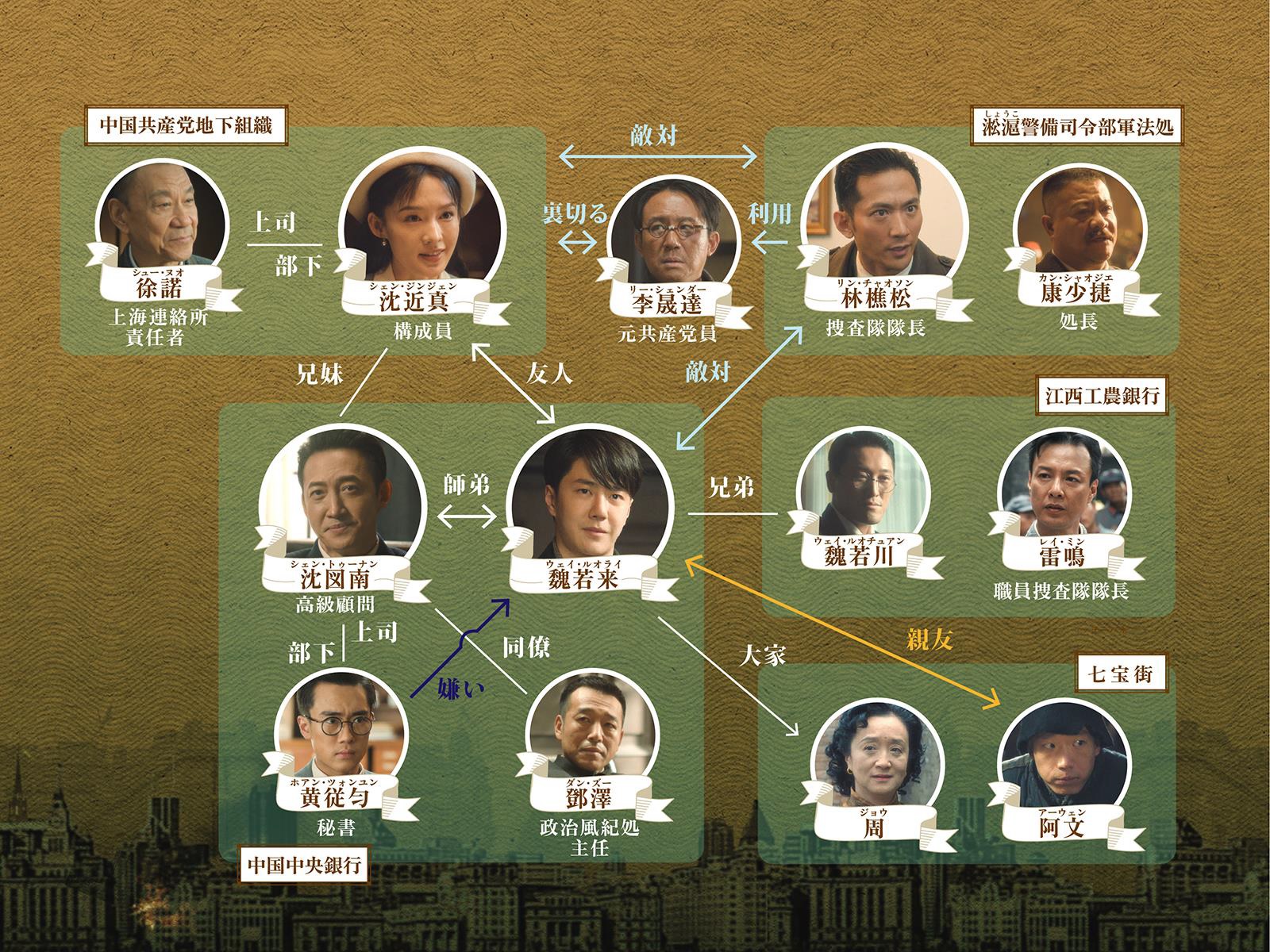 主人公・魏若来を演じるのは、「陳情令」で大ブレイクし、その後も数々の映画・ドラマに出演する人気俳優ワン・イーボー。地方出身の青年が、謀略と暴力にさらされながら鍛えられ、国を動かす金融家へと成長していく姿を、爆破シーンや苛烈な拷問シーンに果敢に挑戦するなど、文字通り体当たりの演技で表現している。脇を固める俳優陣も実力派が揃っており、魏若来に大きな影響を与えることになる重要人物、国民党中央銀行高級顧問・沈図南を、大ヒット作「慶余年~麒麟児、現る~」に出演し、中国ドラマファンにはお馴染みの顔となったワン・ヤンが好演。さらに、国民党を信望する沈図南を兄に持つも、密かに共産党地下組織の構成員として活動する沈近真を、同じく「慶余年~麒麟児、現る~」で知られる美人女優リー・チンが演じている。 *「猫眼専業版」2024/8/1時点