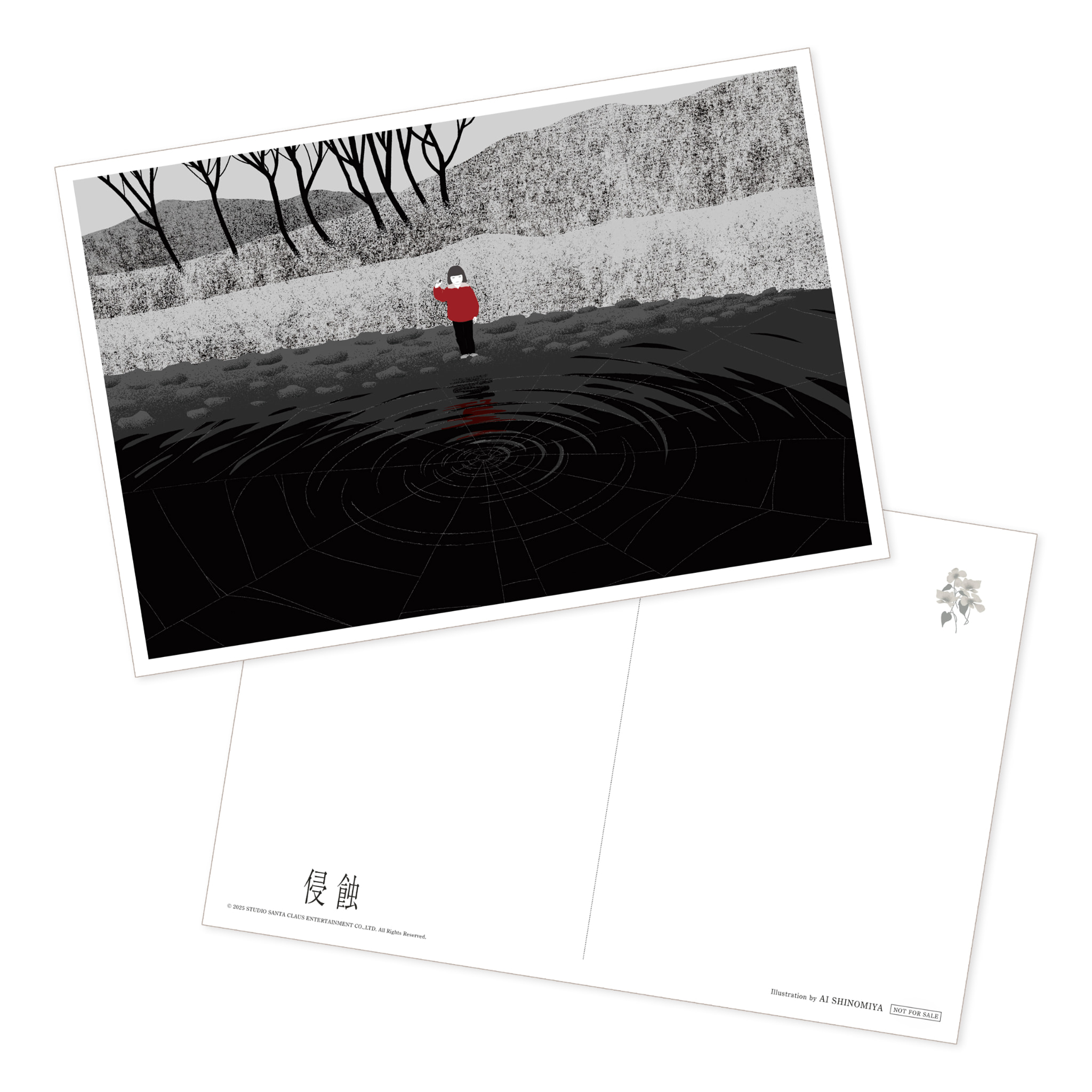 桐野夏生「ダークネス」の書籍の装画などで知られ、本作のオルタナティブポスターのイラストを手掛けた四宮愛によるアートビジュアルポストカード。本編冒頭、ソヒョンが川辺に立つシーンから着想を得たイラストで、赤い服を着た少女がぽつんと川淵に佇立つ姿は、どこか不穏な気配が漂う。ここでしか手に入らない特別な入場者プレゼントとなっている!