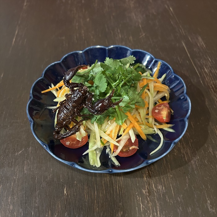 青パパイヤソムタム(サソリの素揚げトッピング)