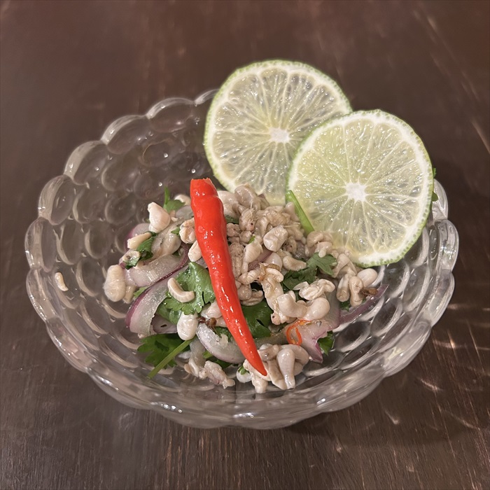 ライム、唐辛子、シーズニング、ナンプラーで下味をつけたプラードゥック(ナマズ)をフライにし、ナムプリックヌム(タガメのディップソース)を添えました。柔らかな食感、フルーティな香りとスパイスが口いっぱいに広がります。