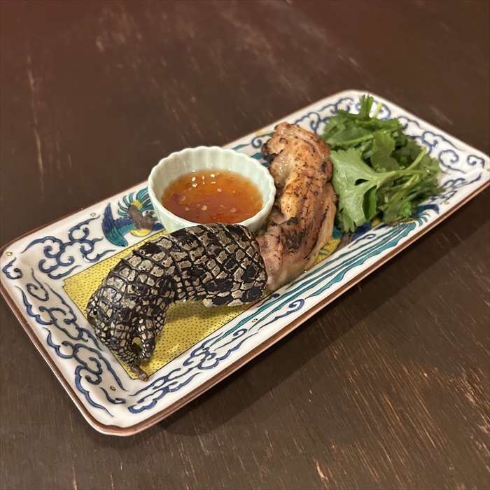 インパクト&食べ応え抜群!ガイ(チキン)ヤーン(焼く)ということで、当店人気のワニの手羽を丸ごと使用したワニヤーン!味付けはタイで長く愛されるシーズニングソースを使用。思いっきり食らいついても良し、わいわいシェアもおすすめ。