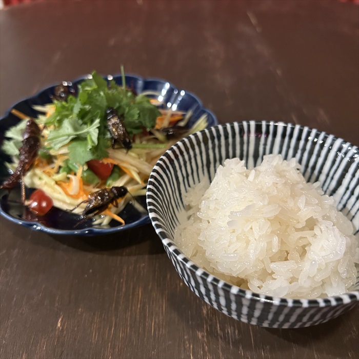 ソム(酸っぱい)タム(叩いて潰す)の通り、青パパイヤを叩いて酸っぱくて辛いソースで和えてホーリーバジルを添えたソムタム。お好みで米とサーカスで人気の昆虫素揚げをトッピング!サクッと楽しくピリッと辛い、あと引くおいしさ。