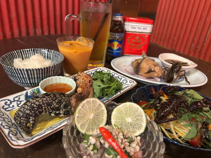 ナマズのフライにタガメのディップソース、昆虫の素揚げをトッピングしたソムタム、蟻の卵のヤムウンセン(春雨サラダ)風、さらにお店で人気のワニを使用したメニューをガイヤーン風にアレンジしたワニ手羽ガイヤーンと食べ応え十分のフルコース。そこにカオニャオ(タイのもち米)を追加すれば、昆虫定食の出来上がり!!さらに元祖レッドブルともいえるタイのエナジードリンク“クラティン・デーン”も用意され、70年以上タイで親しまれるタイの紅茶“チェ―イェン”もタイ風に甘味を効かせてご提供。これを食べればあなたもイサーン地方の住人だ!(9月25日にLOFT9 Shibuyaで実施されるイベント「裏タイフェス~幽体離脱でイサーン体験♡~」では一部、先行試食販売も行われる)