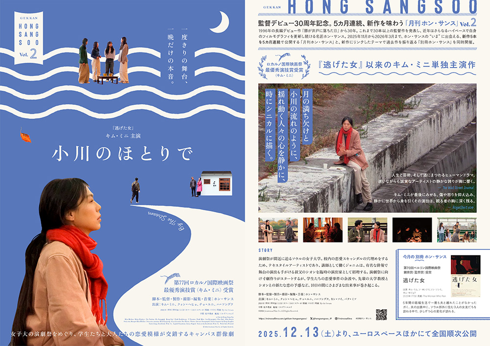 ホン・サンス監督のデビュー30周年を記念して、2025年11月から2026年3月までの5カ月間、最新作を含む新作5本を月替わりで公開する「月刊ホン・サンス」を開催。第2弾は、キム・ミニがソウルの女子大の講師役を演じ、第77回ロカルノ国際映画祭で最優秀演技賞を受賞した『小川のほとりで』(英題:By the Stream)。さらに、一部劇場限定で、新作にリンクしたテーマで過去作を振り返る特集「別冊ホン・サンス」では、キム・ミニが3人の女友達を訪ね歩く、ここ数年のホン・サンス作品の中でも屈指の人気を誇る『逃げた女』(20)。繊細で奥行きのある主演キム・ミニの魅力を、新旧2作を通して堪能できる贅沢なプログラムとなっている。