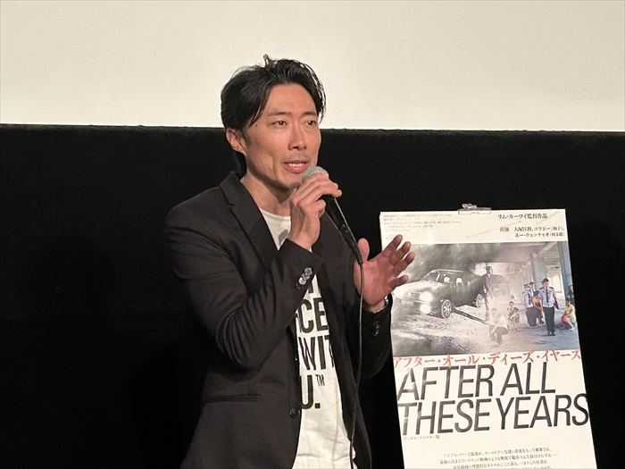 「今日は僕のデビュー作『アフター・オール・ディーズ・イヤーズ』で主演ア・ジェを演じてくれた、大塚匡将さんをお迎えして舞台挨拶を行います」と、リム・カーワイ監督が盟友大塚匡将さんを紹介すると会場は大きな拍手に包まれた。