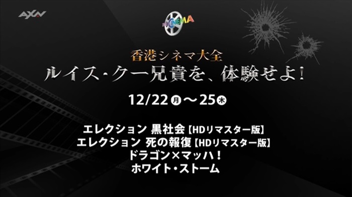 香港ノワールの旗手として名高いジョニー・トー監督が、香港最大の暴力団の会長選挙を題材に仁義なき抗争を描いた作品で、黒社会の中で頭角を現す次世代リーダーをルイス・クーが演じた『エレクション 黒社会【HDリマスター版】』、『エレクション 死の報復【HDリマスター版】』の2部作をCSベーシック初放送、トニー・ジャー&ウー・ジンの2大格闘マスターが競演し、香港で暗躍する、ルイス・クー演じる首領が率いる臓器密売組織と闘う傑作アクション『ドラゴン×マッハ!』、麻薬王と金融王──かつての義兄弟が宿敵に!ルイス・クーが麻薬王、アンディ・ラウが金融王を演じた香港ノワール・アクション『ホワイト・ストーム』の4作品を12月22日(月)~25日(木)特集放送。
