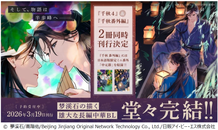 日販アイ・ピー・エス株式会社(本社:東京都文京区、代表取締役社長:佐藤 弘志、https://www.nippan-ips.co.jp/ )は、企画・運営する出版レーベル「ヴォワリエブックス( https://voilierbooks.com/ )」より発売する長編中華BL『千秋(せんしゅう)』日本語版 第4巻(通常版/特装版)と、日本語版限定ミニ番外「中元節」を収録した『千秋 番外編』計3冊の発売日が、2026年3月19日(木)に決定したことをお知らせします。