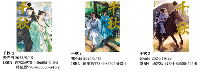 原作は、中国のWeb小説サイト「晋江文学城」で連載されていた武侠BL小説です。本や映像、音楽などさまざまなコンテンツのレビューを掲載する「Douban(ドウバン)」では評価が8.1 点(10点満点中)と高評価*1で、Live配信サイト「猫耳FM」ではラジオドラマが配信され、再生合計は4,858 万回超と大人気です。日本国内での注目度も高まっており、『千秋』日本語版第1巻と第2巻発売時の日本語版公式サイトへ訪問者数を比較すると約16倍*2に増加しています。レビューでも「とにかくページを捲る手が止まらなかった!」「続きが待ち遠しい!」「単なるBLに収まらない作品」といった声をいただいています。