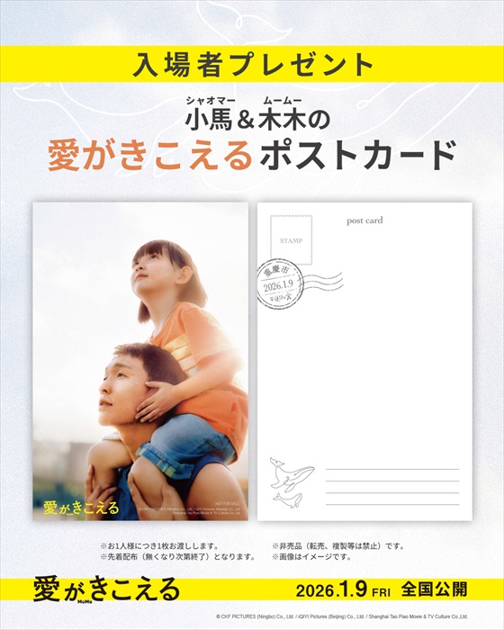 劇場入場者プレゼントとして、互いを思いあうふたりに温かな光が指す本作の日本版ビジュアルをベースにしたポストカードの配布が決定。宛名面には本作が撮影された中国・重慶の消印や、劇中シャオマーとムームーの絆をしめす重要なモチーフでもある“鯨”のイラストがプリントされた愛らしいデザインに。2026年1月9日(金)より本作の公開劇場にて鑑賞者に先着でプレゼントする。