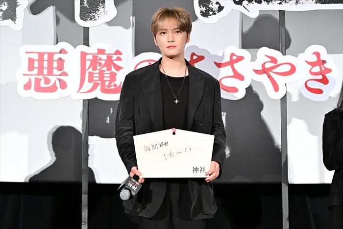 祈祷師という設定にちなんで「手に入れたい能力」を絵馬型パネルに書いてそれぞれ発表。熊切監督は「眼で映画を撮る能力」、木野は「全てのものと会話できる能力。人も動物も植物も石も…」と妄想。JAEJOONGは「瞬間移動した~い」と可愛らしい日本語でつづり、会場を和ませた。続けて「今日の朝、東京に着きました。最近は色々な国に行っているので、瞬間移動が出来たらファンの皆さんに近づけるし、物理的な問題が無くなれば人生も楽しくなる。ファンの皆さんを待たせることが僕は心配。どこかに逃げるのではないかと…」とファン思いの一面を覗かせ、歓声を浴びていた。