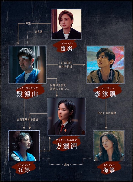 2つの事件の真相を追うことになる若手検察官・方霊淵を演じたのは、「狂飆<きょうひょう>-End of the Beginning-」で一躍ブレイクした実力派女優ガオ・イエ。理性的でありながらも内に熱い思いを秘めた方霊淵というキャラクターを、確かな演技力で好演した。ある殺人事件を追う中で、別の事件の犯人として自ら出頭することになるベテラン検察官・段鴻山を演じたのは、「三体」「始皇帝 天下統一」などで主演を務めるチャン・ルーイー。拘留され徐々に疲弊していきながらも、僅かな情報から真相を推し量るベテラン検察官の姿を、繊細な演技で表現した。また、「不眠日-メビウス-」「長風渡~あなたと綴る、運命の縁~」などで人気を集めるバイ・ジンティンが、人を殺めた過去と、段鴻山への複雑な感情を抱える青年・李沐風(リー・ムーフォン)役で登場。これまで一貫して、爽やかで清潔な印象を与えてきた彼が、物語の鍵を握る闇深い人物を演じるギャップにも注目だ。