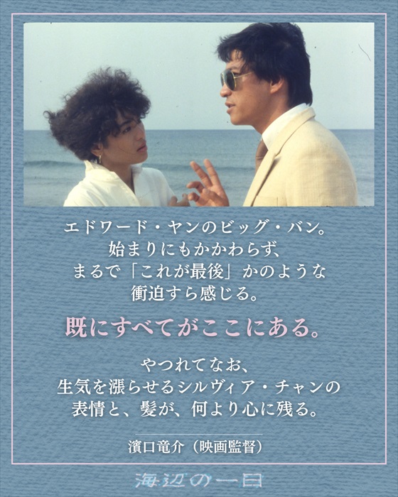 このたび、エドワード・ヤン監督の長編デビュー作『海辺の一日 4Kレストア』を、2026年7月10日(金)よりBunkamuraル・シネマ 渋谷宮下、角川シネマ有楽町、シネマート新宿ほか全国公開することが決定いたしました。1983年に発表された本作は、『恐怖分子』『牯嶺街少年殺人事件』『ヤンヤン 夏の想い出』へと至るエドワード・ヤンの長編デビュー作であると同時に、後にウォン・カーウァイ作品などを通じて世界的撮影監督となるクリストファー・ドイルの長編デビュー作でもあります。世界映画史を導いていく二人の才能、その出発点にして、これまで限られた機会にしか触れることのできなかった“伝説の傑作”が、ついに日本で初めて一般劇場公開されます。