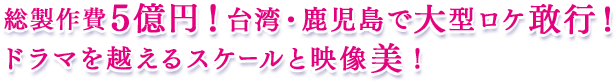 台湾シェアNo.1と言われる三立テレビの開局20周年記念ドラマの本作。制作費は5億円が費やされ、舞台である1970年代の台湾・北投の風景を見事に再現!さらに、大規模な鹿児島ロケも敢行!桜島、霧島温泉、千本イチョウなど、観光スポットもふんだんに盛り込まれ、100人ものエキストラが集められるなど、ドラマでは滅多に見られない壮大なスケールにも注目!