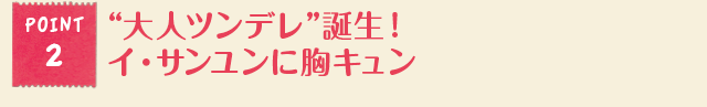 本作のときめきポイントは、イ・サンユン演じる“大人の王子様”だ。普段は意地悪を言いながら、ヒロインを放っておけず、陰で見守り、窮地を助けるなど、アラフォー男子がツンデレる様にきゅんきゅん。アラフォーヒロインもので昨今、流行りの年下男子とは異なり、同い年という身近感も心くすぐる!