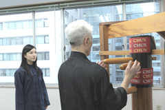 「では、やってみてください」のチェン先生の言葉で木人トレーニングに挑戦する古川さんですが