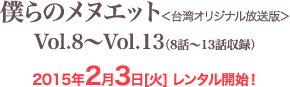 ![僕らのメヌエット<台湾オリジナル放送版>Vol.8~Vol.13(8話~13話収録)2015年2月3日[火] レンタル開始!](img/rental_txt02.gif)