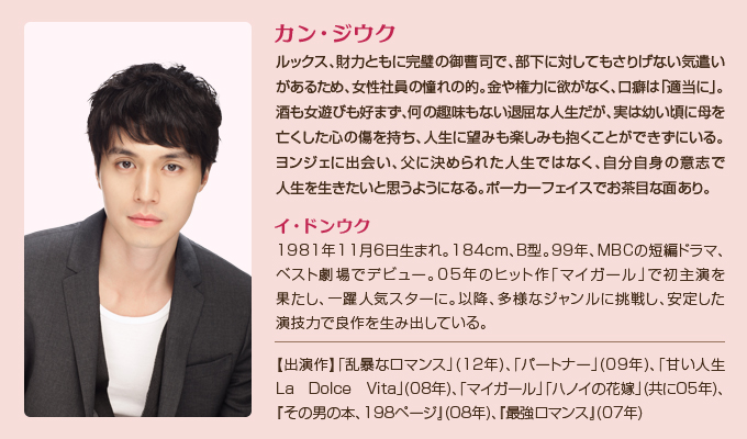 ヨンジェの高校時代の国語教師で、バケットリストに書いた「Sに許してもらう」のS、キム・ドンミョンには「冬ソナ」でお馴染みの名優チョン・ドンファン。少ない出演シーンながら、後半のキーマンとして存在感を発揮。