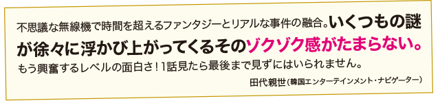 新人刑事だったが、警察大学卒 のプロファイラーとしての高い能力を買われて長期未 解決事件専門チームに配属。ある日、廃棄されるはず だった無線機を偶然手にして、過去の時代を生きるイ・ジェハン刑事と交信を開始。協力して事件を解決に 導いていく。