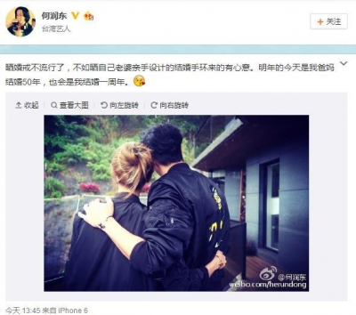 本日 3月10日、何潤東(ピーター・ホー)は微博(ウェイボー)で「結婚指輪の写真をアップするのはもう時代遅れ!それより奥さんがデザインした結婚ブレスレットの写真をアップしたほうがいい!来年の今日は父と母の結婚50周年記念日!そして僕の結婚1周年記念日だ!」と結婚宣言をしました。