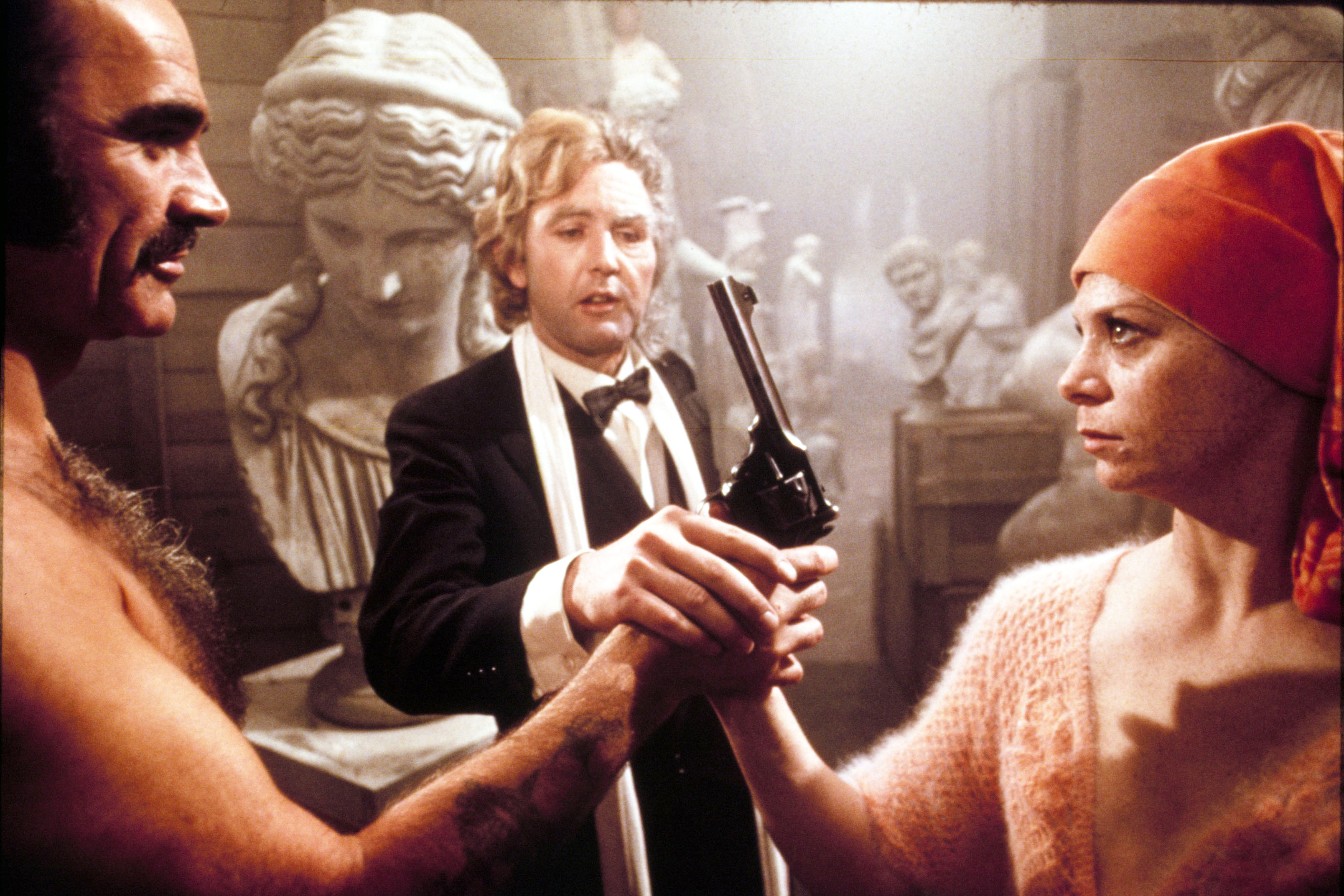 主演は、初代「007」のショーン・コネリー。弁髪、胸毛に赤ふんどしー半裸で大地を駆けるその雄姿によって、それまでのボンドのイメージを一新した。共演は『愛の嵐』(74)で一世を風靡し、最近でも『DUNE/デューン 砂の惑星』などで活躍中のシャーロット・ランプリング。性を超越したクールな美貌は、まさにキャリア絶頂の美しさだ。