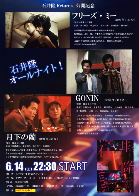 上映作品は『GONIN』(95年/松竹)、『月下の蘭』(91年/日活)、『フリーズ・ミー』(2000年/日活)の3本立て。