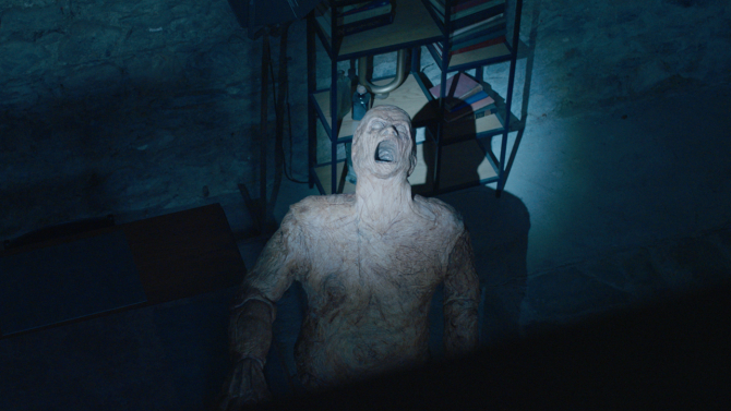 そして血塗られた義眼のようなもの、子ども2人の写真、木製のマネキンなど不気味さ満載の様子を捉えたものとなっている。