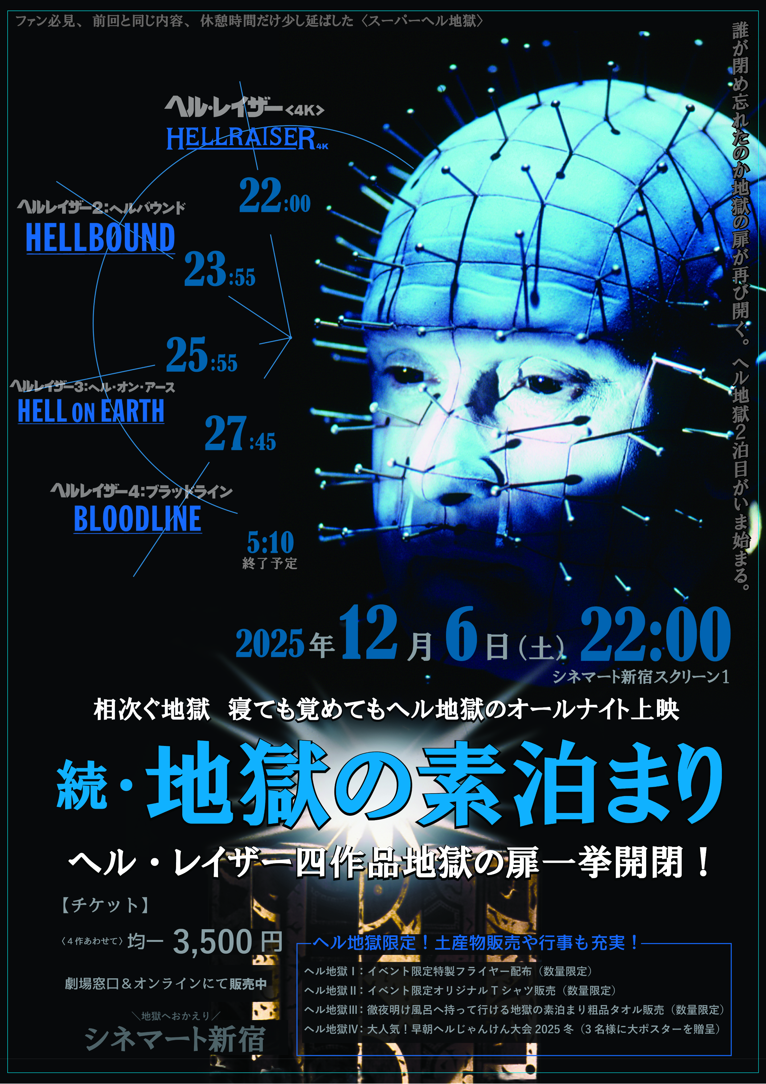 12 月 6 日(土)22:00~「続•地獄の素泊まり <スーパーヘル地獄>」 ヘルレイザー4 作品•地獄の扉一挙開閉 !