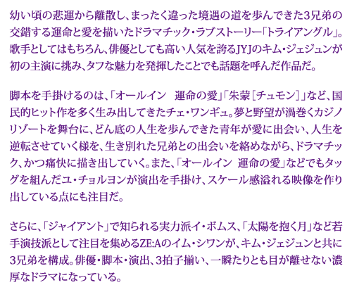 主人公3兄弟が生まれ、物語の主舞台となる町・舎北は、韓国の江原道にある山間の町だ。劇中でも言われているように、かつては炭鉱で栄え、現在は「江原ランド」という韓国で唯一、韓国人が入場できるカジノリゾートのある町として知られている。 |